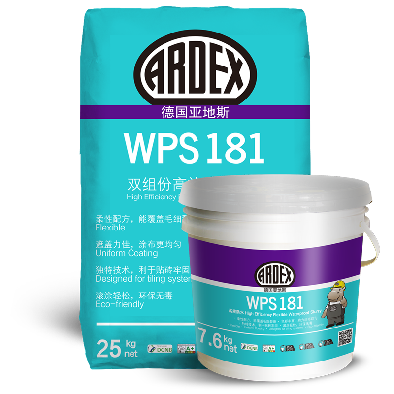 ARDEX WPS 181是一种双组份高分子聚合物水泥基防水浆料。可用于混凝土、水泥砂浆等绝大多数基层上,与后续贴砖等施工有良好的粘结性能。适应有轻微变形和裂纹的表面,防水透汽,整体涂覆式防水抗渗漏。抗沉淀,易涂刷。特别适用于刚性墙地面的大面积防水涂刷。